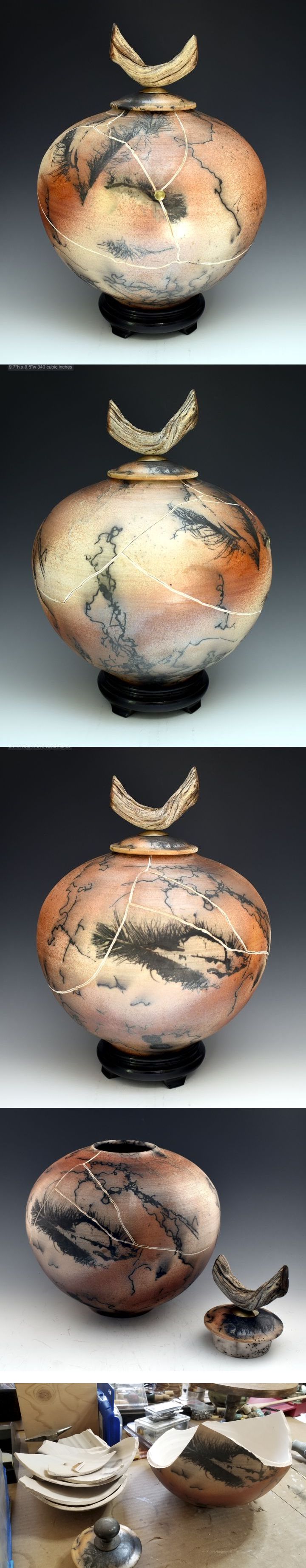 Horse Hair 315 Kintsugi "Together Always" 9.7"h x 9.5"w 350 cubic inches One of a kind companion cremation urn $1800.00 My re-built or restored pots are grounded in the Japanese art of Kintsugi More Kintsugi information and inspiration Please scroll down for details. This piece has quite a history.... The first firing was done using horse hair techniques. Turkey feathers were also applied during the smoking stage. After damage from a studio fire the work was cleaned and reassembled. Very old mesquite wood from Texas, brass fitting and a contrasting removable polished wooden base were added increasing the beauty and history of this unique work. It has a deep flange which is easily cemented in place with an easily removed silicone calking or adhesive. Horse hair and turkey feather symbolism The commonality that links all horse hair meanings in many cultures is that using or wearing it is a symbol for peace and tranquility. Horse hairs spiritual meaning offers a connection with divine energy and reinforces the spiritual power of the individual. It is believed to be a constant reminder of the person needing to remain in harmony with nature and the higher energy found in all elements. Turkey feathers also represent an ascension from this earthly world to another spiritual dimension- whether it’s heaven or not, so they are often seen placed on gravesites to honor departed loved ones who have gone on before us.