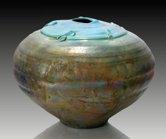 Wheel thrown and altered vessel with multiple Raku glazes See the image below for another view of this piece.