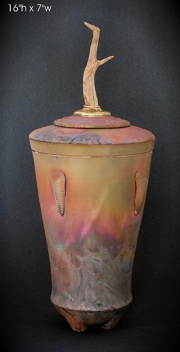 A piece from the archives. Wheel thrown and hand built vessel, Copper matte glazed. This piece has found objects: wood, copper, and brass additions.